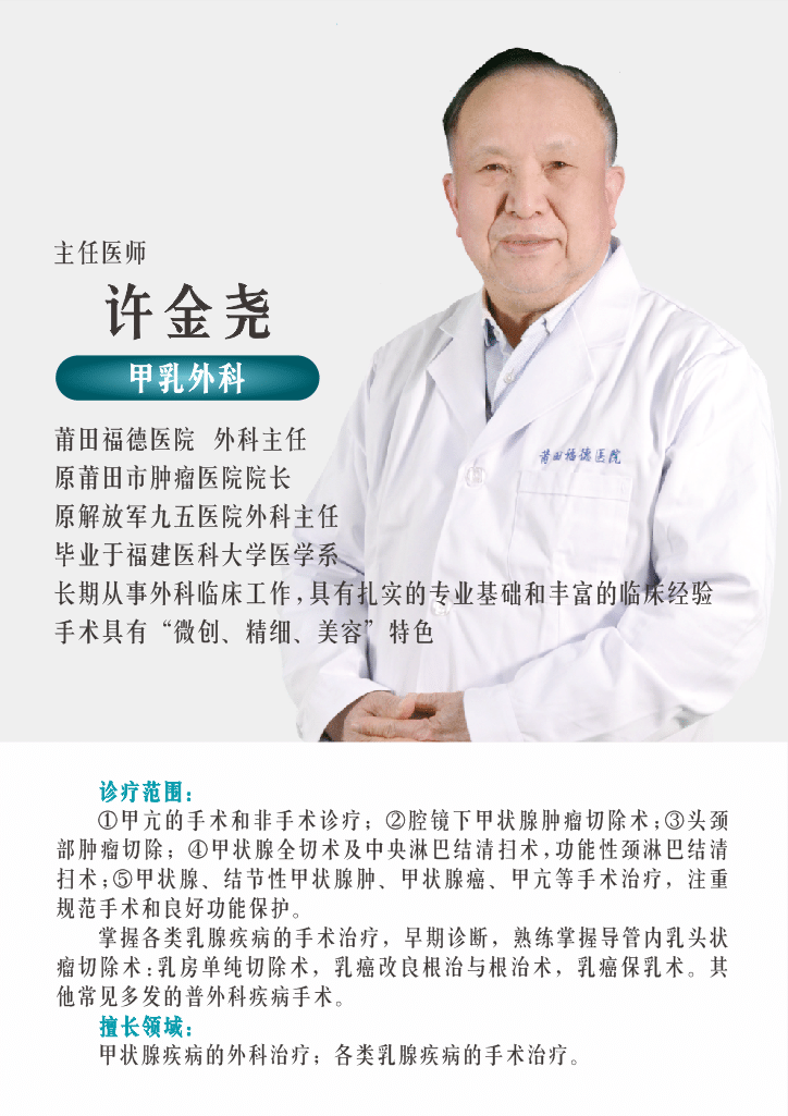 莆田福德医院甲乳外科,汇聚专业力量,致力于为甲状腺和乳腺疾病患者提供优质的医疗服务。科室由原莆田市肿瘤医院院长、原解放军九五医院外科主任、现莆田福德医院外科主任许金尧领衔。许主任从医几十年,长期深耕外科临床手术领域,具备扎实的专业基础与丰富的临床经验,其手术以“微创、精细、美容”为显著特色,为无数患者解除病痛,重塑健康。